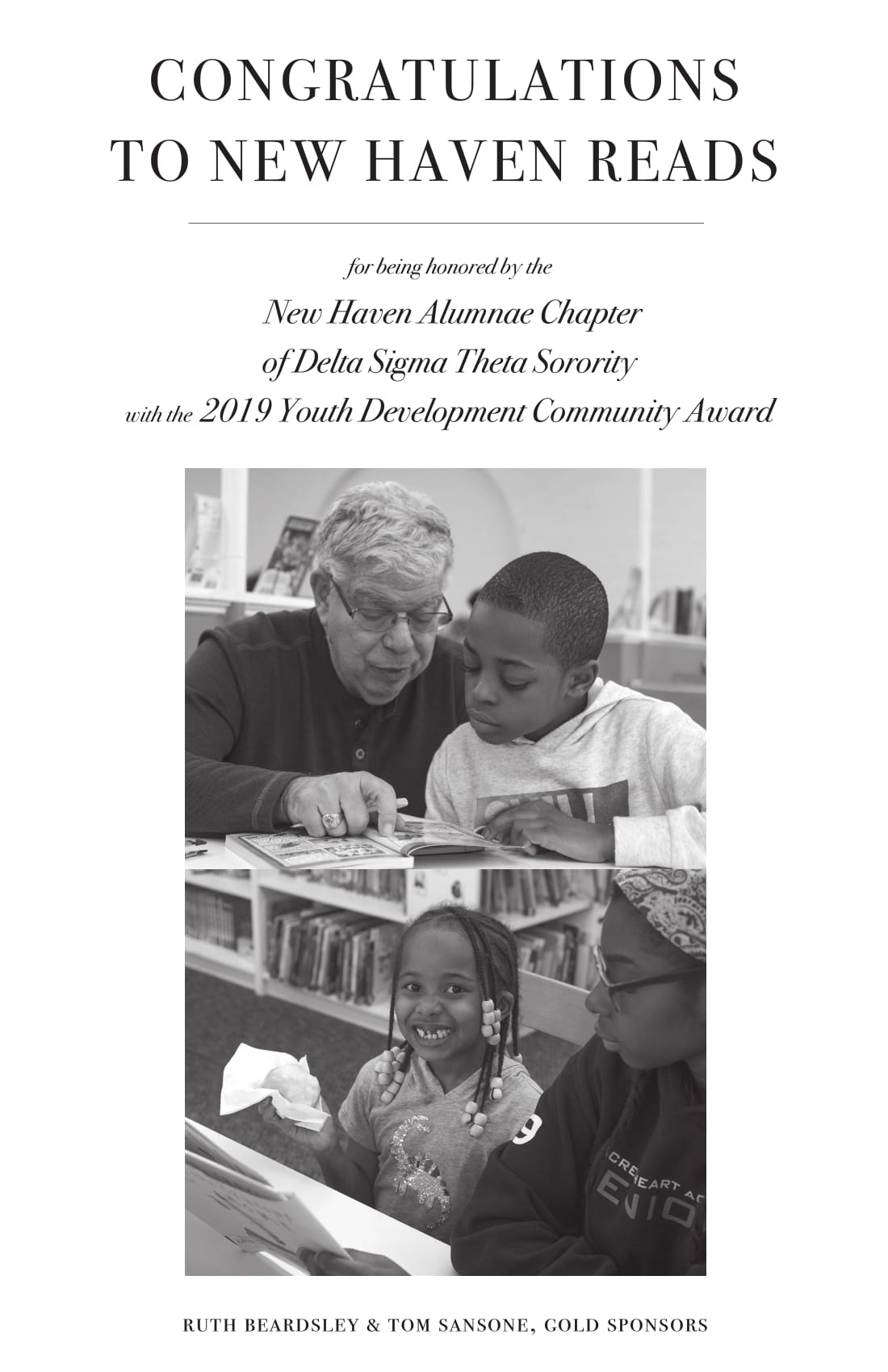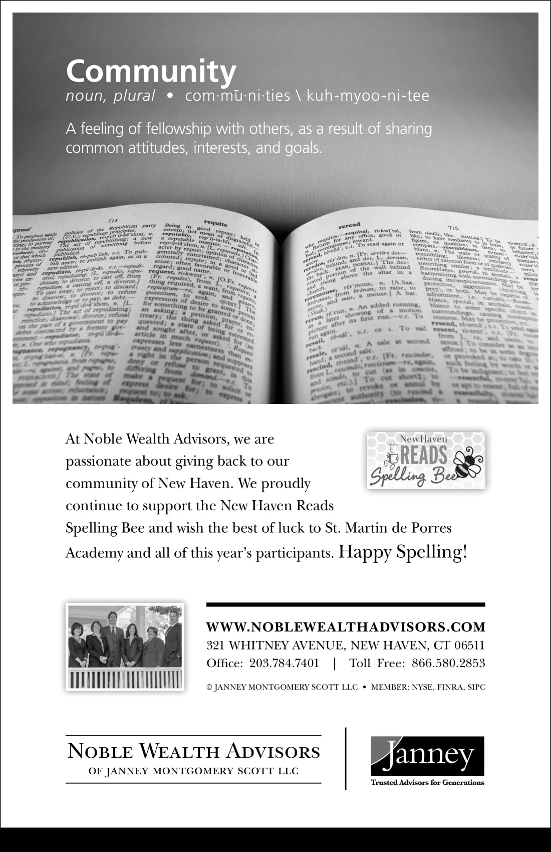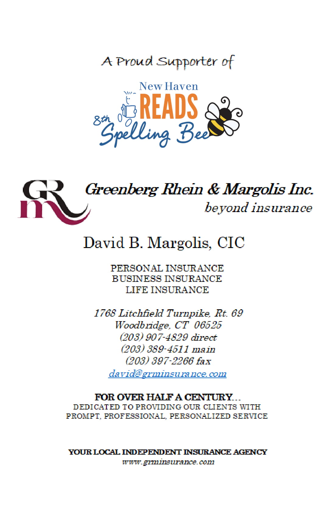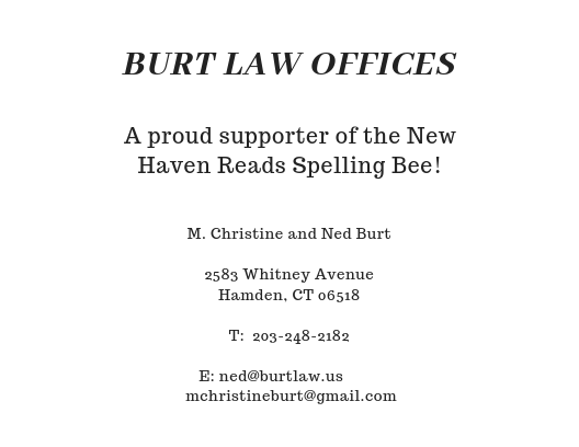 To learn more about our sponsors and why they support New Haven Reads, follow along on Twitter, Instagram, and Facebook as we count down to the 8th Annual Spelling Bee on Oct. 25. Want to compete? Team spots are going fast! Register your three-person team here for $225, and remember: 100 percent of proceeds go toward free New Haven Reads literacy programs.